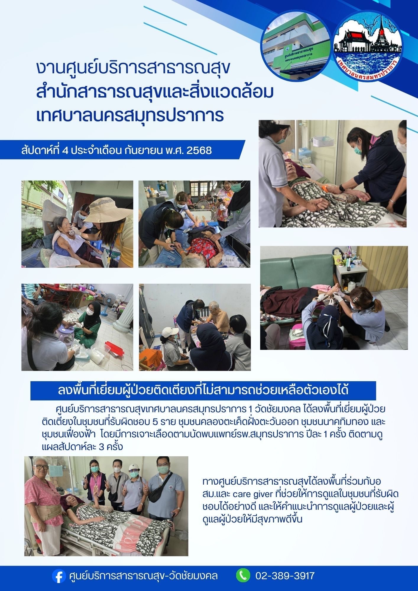 ศูนย์บริการสาธารณสุข เทศบาลนครสมุทรปราการ 1 (วัดชัยมงคล) ได้ลงพื้นที่เยี่ยมผู้ป่วยติดเตียงร่วมกับ อสม.และ CARE GIVER ในชุมชนที่รับผิดชอบ 5 ราย ณ ชุมชนคลองตะเค็ตฝั่งตะวันออก ชุมชนนาคทิมทอง และชุมชนเฟื่องฟ้า โดยให้บริการเจาะเลือดตามนัดพบแพทย์โรงพยาบาลสมุทรปราการ