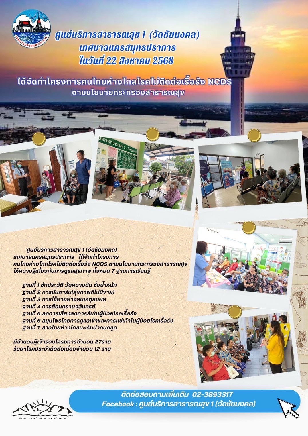 ศูนย์บริการสาธารณสุข 1 (วัดชัยมงคล) เทศบาลนครสมุทรปราการ ได้จัดทำโครงการคนไทยห่างไกลโรคไม่ติดต่อเรื้อรัง NCDs ตามนโยบายกระทรวงสาธารณสุขให้ความรู้เกี่ยวกับการดูแลสุขภาพ ทั้งหมด 7 ฐานการเรียนรู้ มีผู้เข้าร่วมโครงการจำนวน 27 ราย และรับยาโรคประจำตัวต่อเนื่องจำนวน 12 ราย
