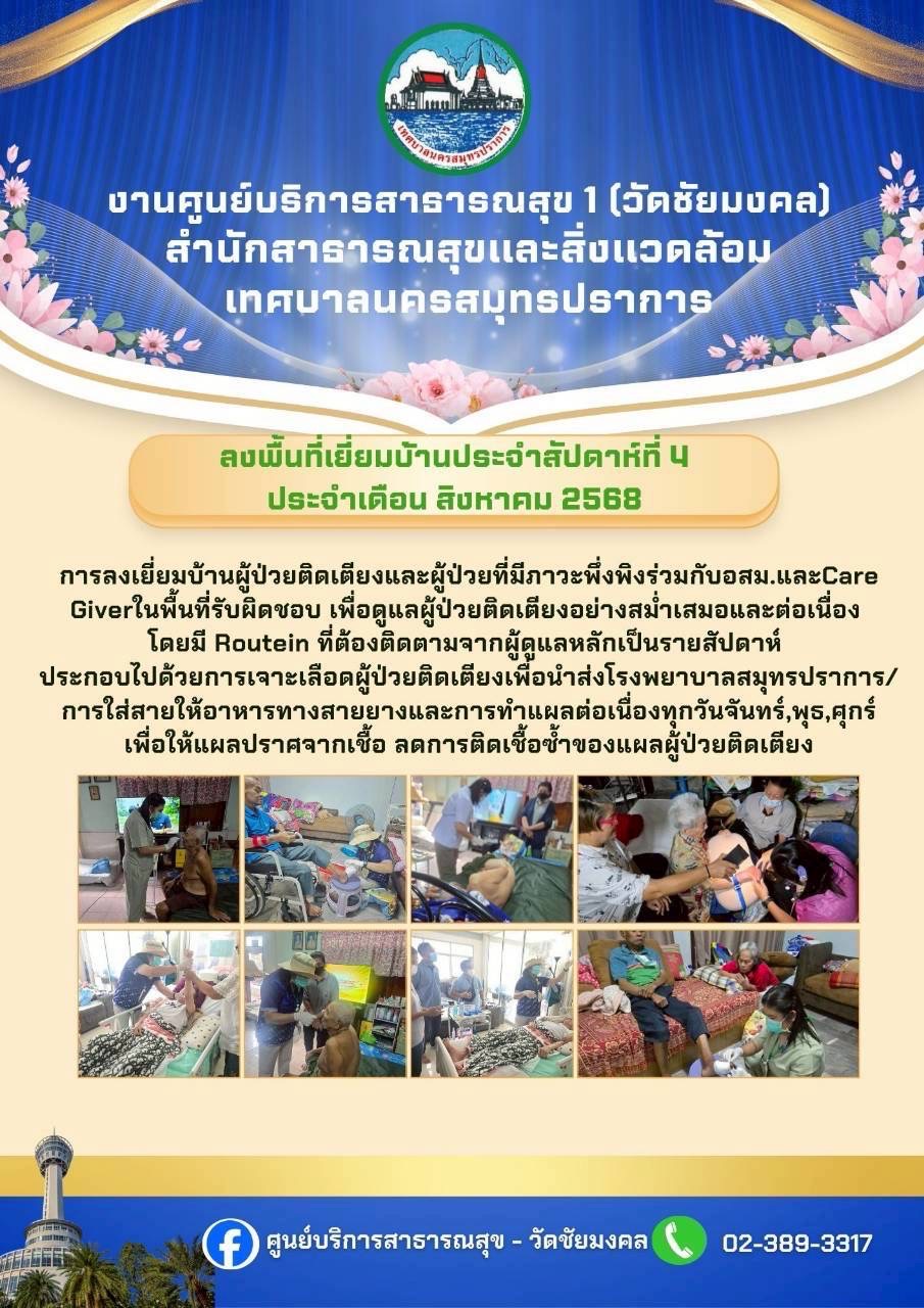 ศูนย์บริการสาธารณสุข 1 (วัดชัยมงคล) ลงเยี่ยมบ้านผู้ป่วยติดเตียงและผู้ป่วยที่มีภาวะพึ่งพิงร่วมกับ อสม. และ CARE GIVER ในพื้นที่รับผิดชอบ เพื่อดูแลผู้ป่วยติดเตียงอย่างสม่ำเสมอและต่อเนื่อง โดยมี ROUTINE ที่ต้องติดตาม ประกอบด้วย การเจาะเลือดผู้ป่วยเพื่อนำส่งโรงพยาบาล การใส่สายอาหารทางสายยางและการทำแผลต่อเนื่อง เพื่อให้แผลปราศจากเชื้อ ลดการติดเชื้อซ้ำของผู้ป่วยติดเตียง