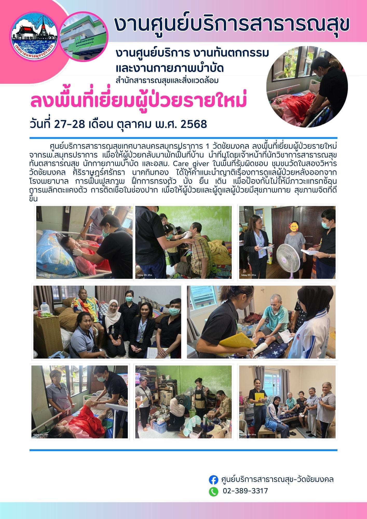 ศูนย์บริการสาธารณสุข เทศบาลนครสมุทรปราการ 1 วัดชัยมงคล ลงพื้นที่เยี่ยมผู้ป่วยรายใหม่จากโรงพยาบาลสมุทรปราการ เพื่อให้ผู้ป่วยกลับมาพักฟื้นที่บ้าน นำโดยนักวิชาการสาธารณสุข ทันตสาธารณสุข นักกายภาพบำบัด และ อสม. Care giver ในพื้นที่รับผิดชอบ ชุมชนวัดในสองวิหาร วัดชัยมงคล ศิริราษฎร์ศรัทธา นาคทิมทอง ได้ให้คำแนะนำญาติเรื่องการดูแลผู้ป่วย การฟื้นฟูสภาพ ฝึกการทรงตัว เพื่อป้องกันไม่ให้มีภาวะแทรกซ้อน