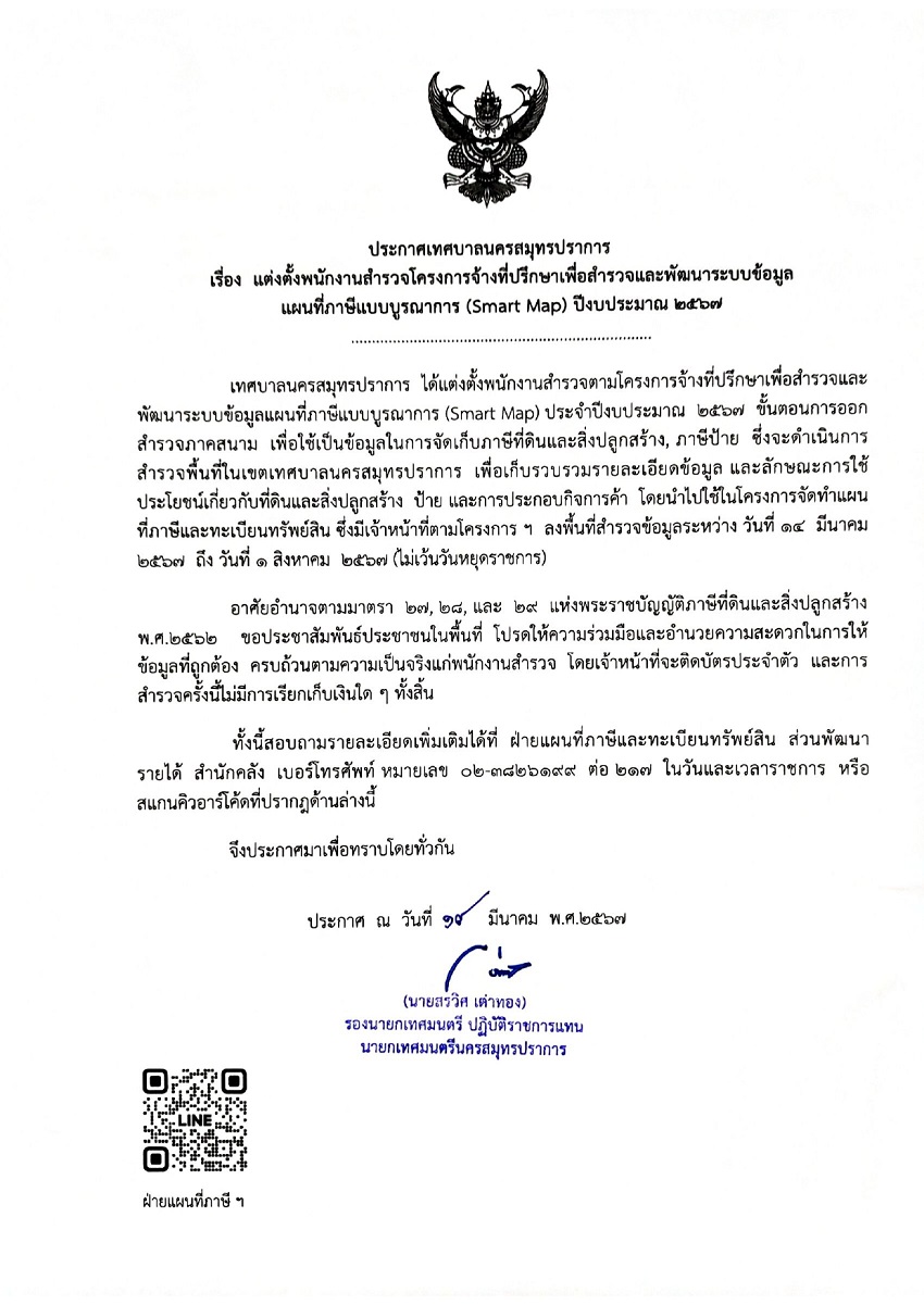 ประกาศ เทศบาลนครสมุทรปราการ เรื่อง แต่งตั้งพนักงานสำรวจโครงการจ้างที่ปรึกษาเพื่อสำรวจและพัฒนาระบบข้อมูลแผนที่ภาษีแบบบูรณาการ (Smart Map) ปีงบประมาณ 2567