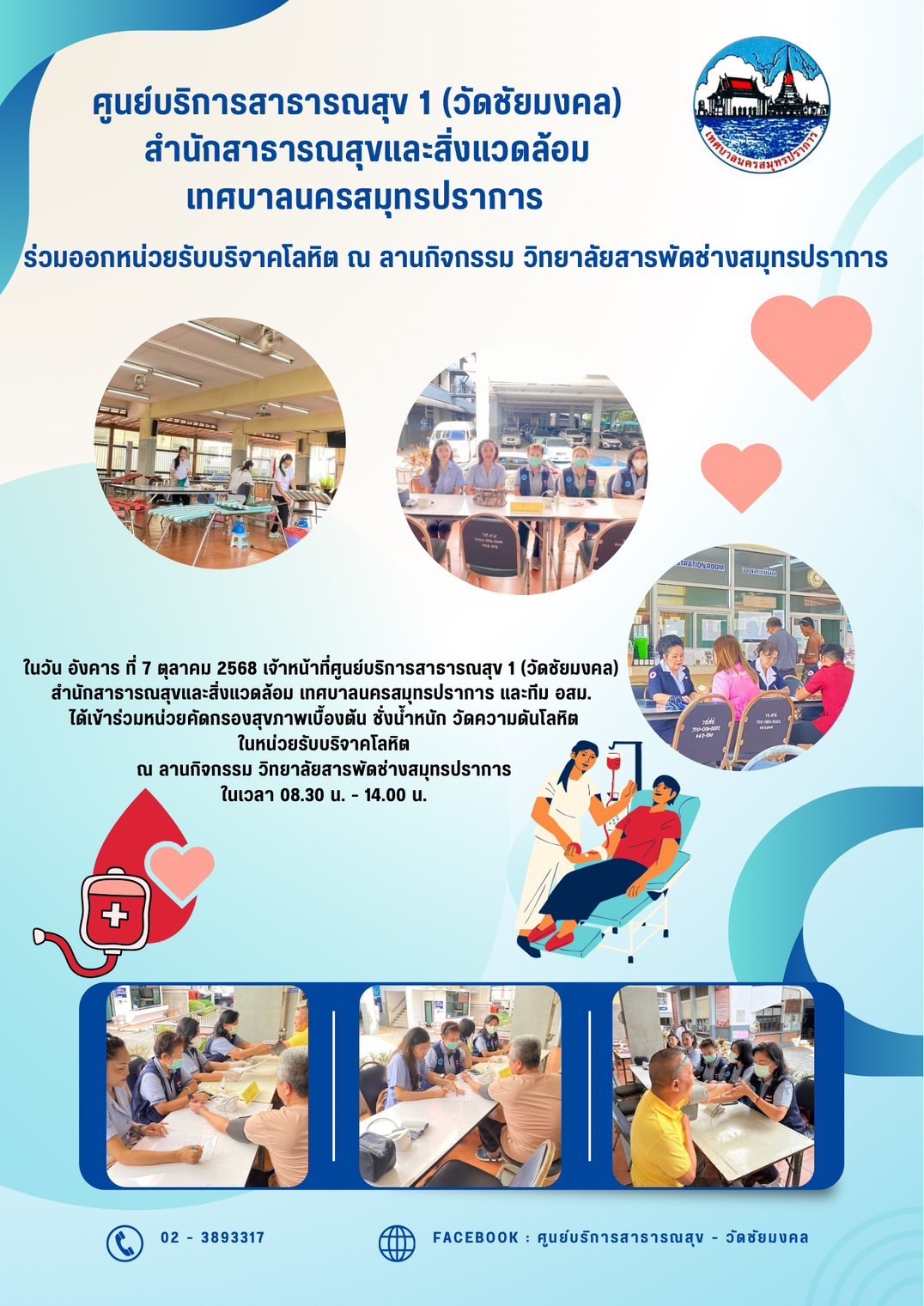 ศูนย์บริการสาธารณสุข 1 (วัดชัยมงคล) สำนักสาธารณสุขและสิ่งแวดล้อม เทศบาลนครสมุทรปราการ และ อสม. ได้เข้าร่วมหน่วยคัดกรองสุขภาพเบื้องต้น ชั่งน้ำหนัก วัดความดันโลหิตในหน่วยบริจาคโลหิต ณ ลานกิจกรรมวิทยาลัยสารพัดช่างสมุทรปราการ