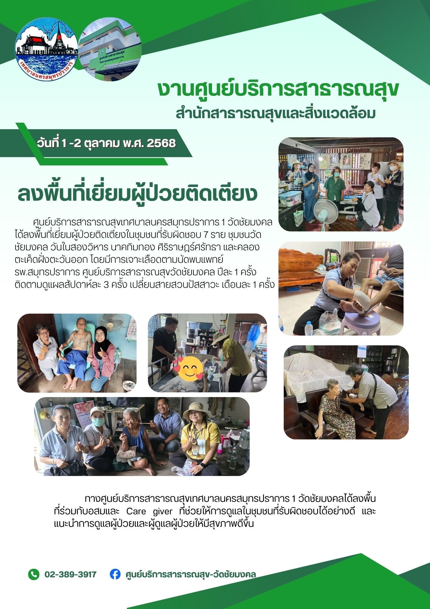 ศูนย์บริการสาธารณสุขเทศบาลนครสมุทรปราการ 1 (วัดชัยมงคล) ได้ลงพื้นที่เยี่ยมผู้ป่วยติดเตียงในชุมชนที่รับผิดชอบ 7 ราย ณ ชุมชนวัดชัยมงคล วัดในสองวิหาร นาคทิมทอง ศิริราษฎร์ศรัทธา และคลองตะเค็ตฝั่งตะวันออก โดยมีการเจาะเลือดตามนัดพบแพทย์ ติดตามดูแผล และเปลี่ยนสายสวนปัสสาวะ