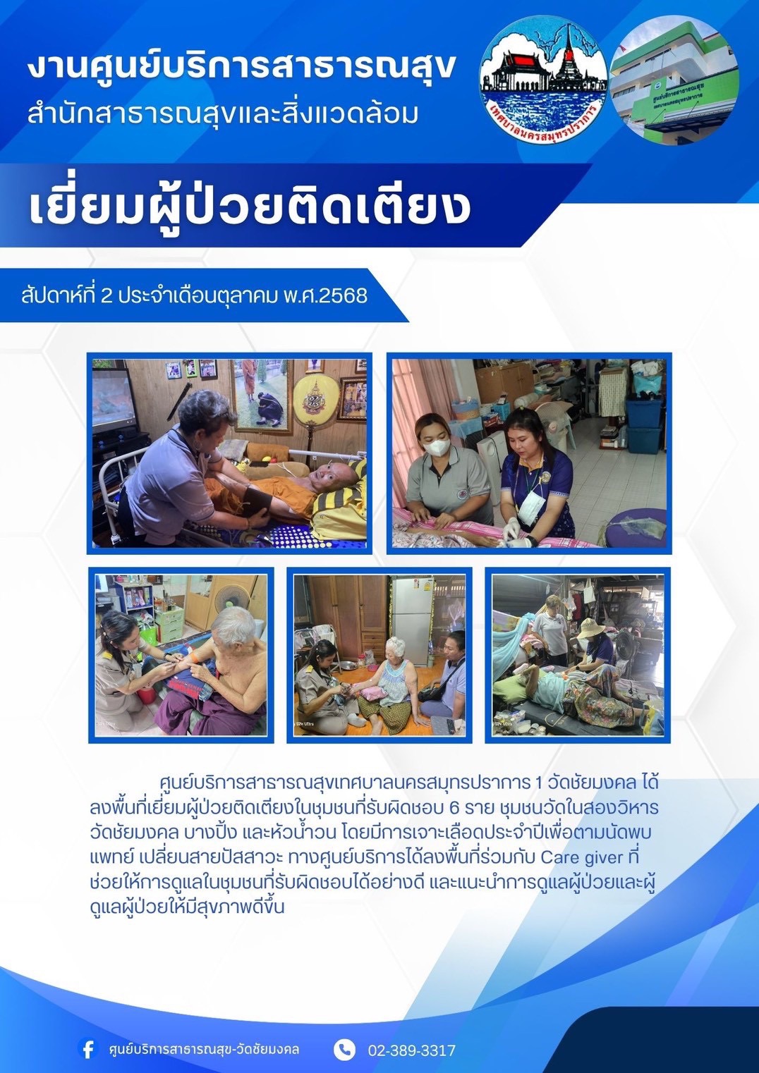 ศูนย์บริการสาธารณสุข เทศบาลนครสมุทรปราการ 1 วัดชัยมงคล ได้ลงพื้นที่เยี่ยมผู้ป่วยติดเตียงในชุมชนที่รับผิดชอบ 6 ราย ชุมชนวัดในสองวิหาร วัดชัยมงคล บางปิ้ง และหัวน้ำวน โดยมีการเจาะเลือดประจำปีเพื่อตามนัดพบแพทย์ เปลี่ยนสายสวนปัสสาวะ ทางศูนย์ฯได้ลงพื้นที่ร่วมกับ Care Giver ที่ช่วยให้การดูแลในชุมชนที่รับผิดชอบได้อย่างดี และแนะนำการดูแลผู้ป่วยและผู้ดูแลผู้ป่วยให้มีสุขภาพดีขึ้น