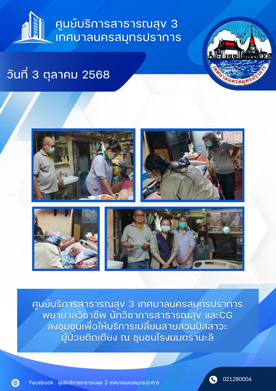 ศูนย์บริการสาธารณสุข 3 เทศบาลนครสมุทรปราการ พยาบาลวิชาชีพ นักวิชาการสาธารณสุข และ CG ลงพื้นที่ชุมชนเพื่อให้บริการเปลี่ยนสายสวนปัสสาวะผู้ป่วยติดเตียง ณ ชุมชนโรงนมตรามะลิ