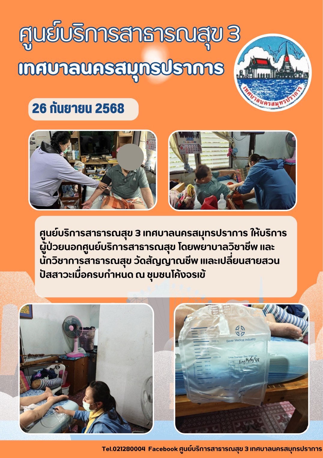 ศูนย์บริการสาธารณสุข 3 เทศบาลนครสมุทรปราการ ให้บริการผู้ป่วยนอกศูนย์บริการสาธารณสุข โดยพยาบาลวิชาชีพ และนักวิชาการสาธารณสุข วัดสัญญาณชีพ และเปลี่ยนสายสวนปัสสาวะเมื่อครบกำหนด ณ ชุมชนโค้งจรเข้