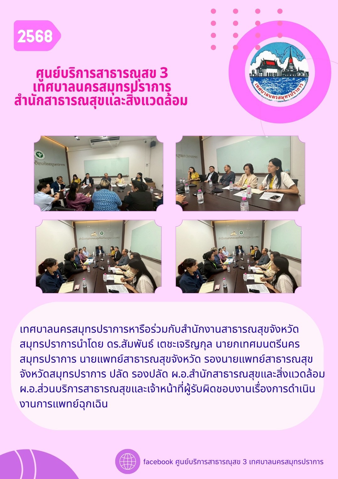 เทศบาลนครสมุทรปราการ ประชุมหารือร่วมกับสำนักงานสาธารณสุขจังหวัดสมุทรปราการ นำโดย ดร.สัมพันธ์ เตชะเจริญกุล นายกเทศมนตรีนครสมุทรปราการ นายแพทย์สาธารณสุขจังหวัด รองนายแพทย์สาธารณสุขจังหวัดสมุทรปราการ ปลัดเทศบาล รองปลัดเทศบาล ผู้อำนวยการสำนักสาธารณสุขและสิ่งแวดล้อม ผู้อำนวยการส่วนบริการสาธารณสุข พนักงานและเจ้าหน้าที่ผู้รับผิดชอบเรื่องการดำเนินงานการแพทย์ฉุกเฉิน