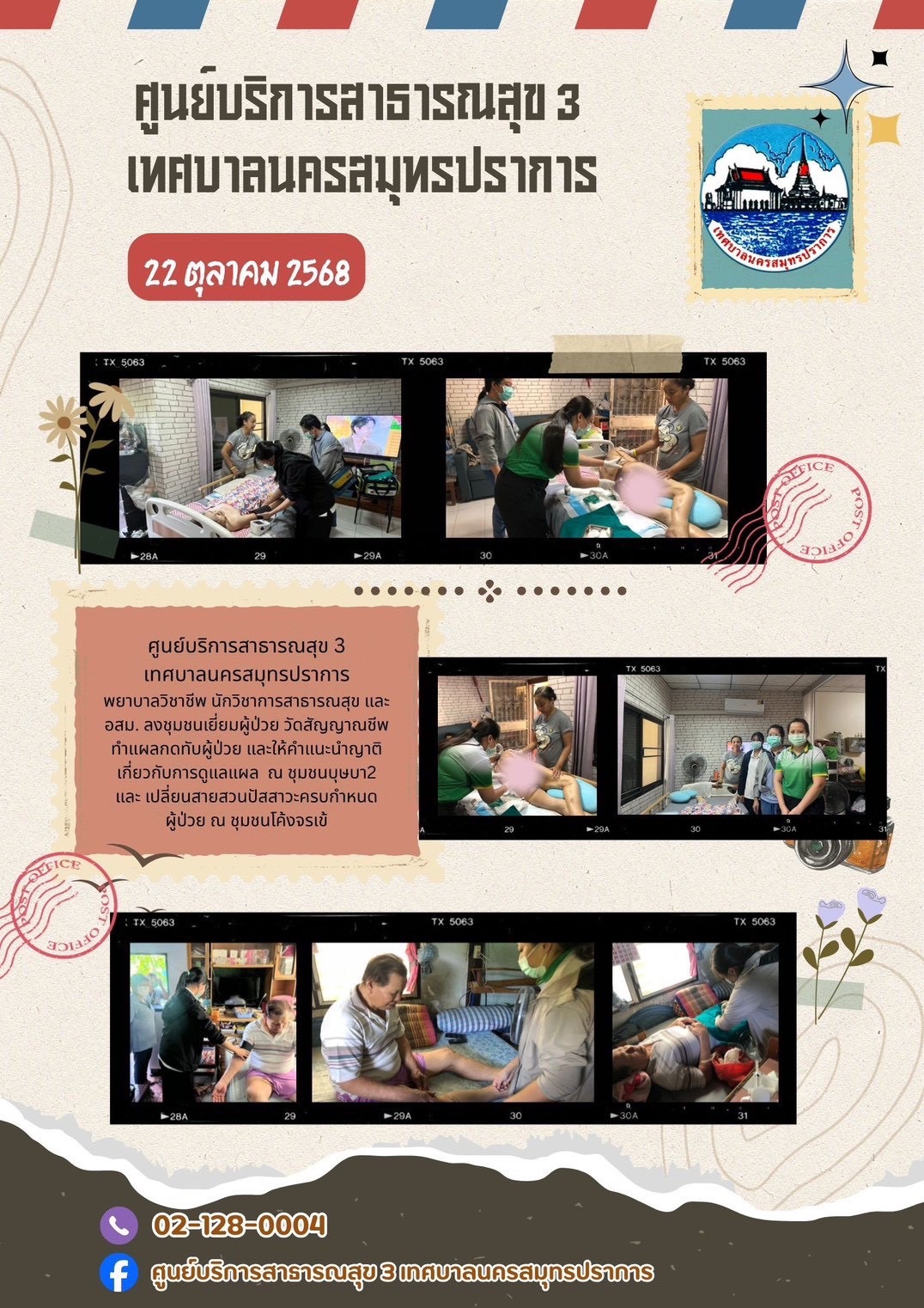ศูนย์บริการสาธารณสุข 3 เทศบาลนครสมุทรปราการ พยาบาลวิชาชีพ นักวิชาการสาธารณสุข และ อสม.ลงชุมชนเยี่ยมผู้ป่วย วัดสัญญาณชีพ ทำแผลกดทับผู้ป่วย และให้คำแนะนำญาติเกี่ยวกับการดูแลแผล ณ ชุมชนบุษบา 2 และเปลี่ยนสายสวนปัสสาวะผู้ป่วย ณ ชุมชนโค้งจรเข้