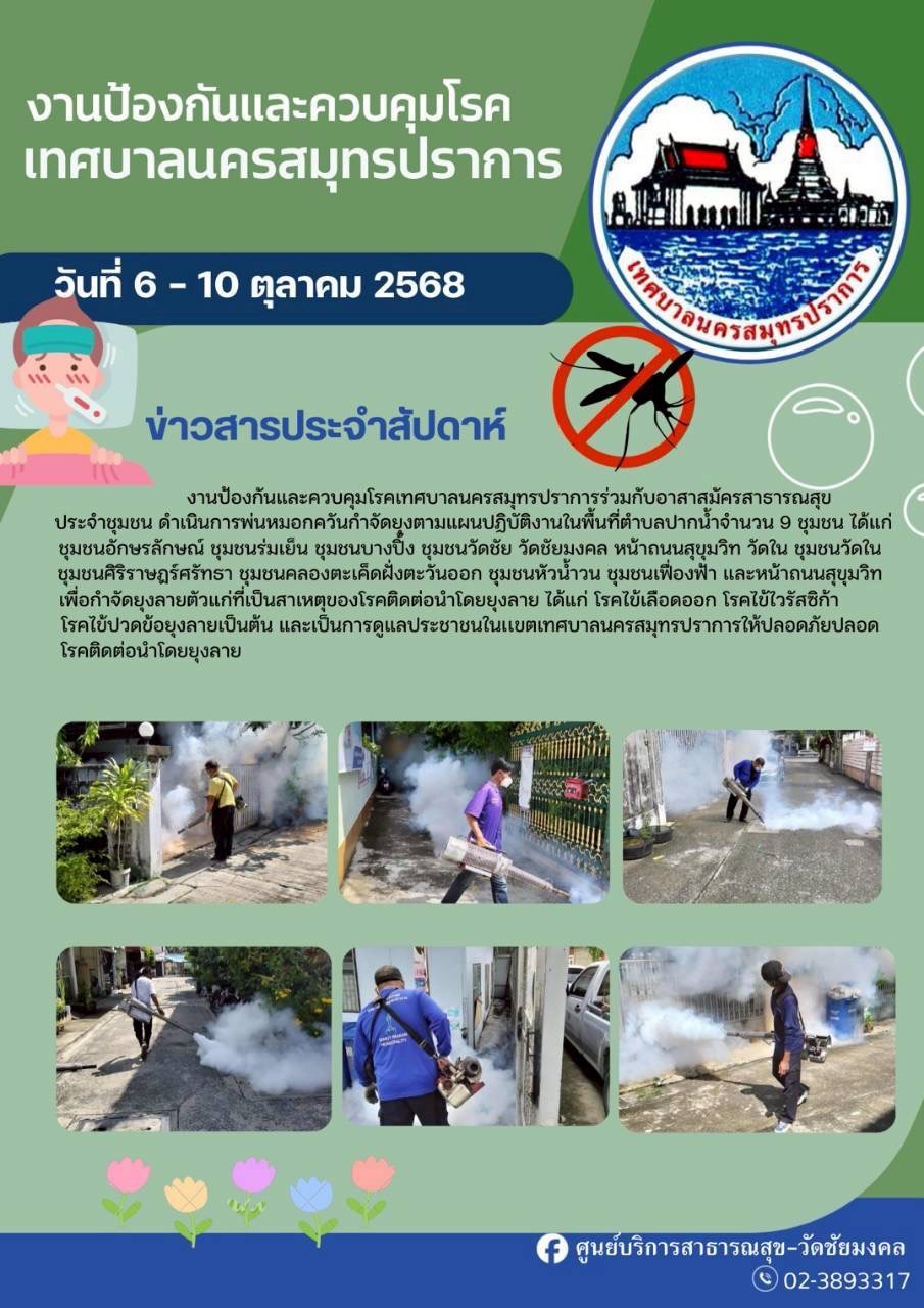 งานป้องกันและควบคุมโรค เทศบาลนครสมุทรปราการ ร่วมกับ อสม.ประจำชุมชน ดำเนินการพ่นหมอกควันกำจัดยุงตามแผนปฏิบัติงานในพื้นที่ตำบลปากน้ำ จำนวน 9 ชุมชน ได้แก่ ชุมชนอักษรลักษณ์ ชุมชนร่มเย็น ชุมชนบางปิ้ง ชุมชนวัดชัยมงคล ชุมชนวัดใน ชุมชนศิริราษฎร์ศรัทธา ชุมชนคลองตะเค็ตฝั่งตะวันออก ชุมชนหัวน้ำวน ชุมชนเฟื่องฟ้า และหน้าถนนสุขุมวิท เพื่อกำจัดยุงลายที่เป็นสาเหตุของโรคติดต่อ ได้แก่ โรคไข้เลือดออก โรคไข้ไวรัสซิก้า โรคไข้ปวดข้อยุงลาย เป็นต้น และเป็นการดูแลประชาชนในเขตเทศบาลนครสมุทรปราการให้ปลอดภัยจากโรคติดต่อ